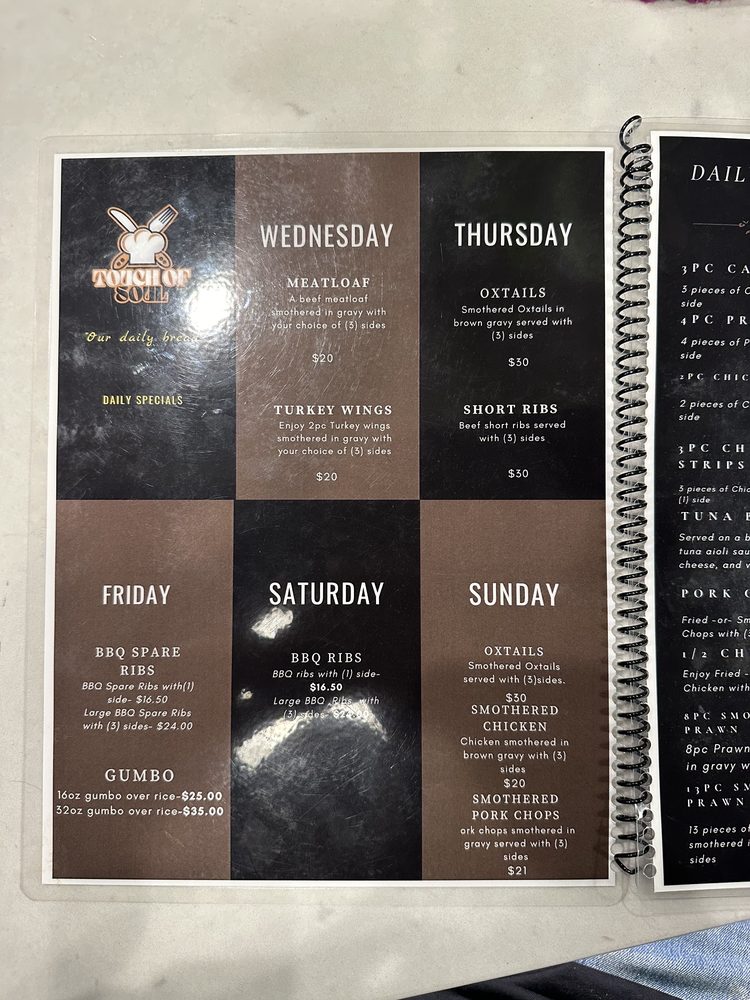 Touch of Soul, located at 3900 Adeline St Ste 100 in Emeryville, CA, is a soulful bar offering a range of menu options. From their 1/2 fried chicken with crispy skin to the flavorful ribs and macaroni, each dish is cooked with precision and care. The friendly staff adds to the welcoming atmosphere, making you feel like part of the family. While the use of plastic utensils may be a downside, the delicious food more than makes up for it. The soul food classics, including ox tails, greens, and yams, are cooked to perfection and served in generous portions. Their catering options are also a hit, making it a great choice for group gatherings and events. Don't miss out on their delightful desserts like cake and cobbler. The lively vibe, delicious food, and attentive service make Touch of Soul a must-visit for anyone looking for authentic soul food in Oakland.